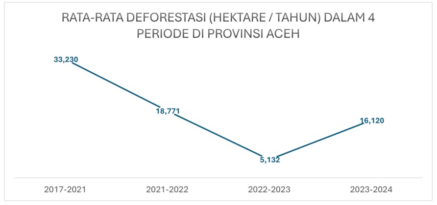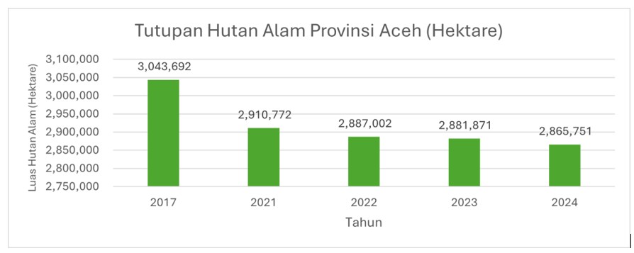 FWI mencatat luas hutan di Provinsi Aceh berkurang sekitar 177 ribu hektare atau 2,5 kali luas Singapura hanya dalam tempo tujuh tahun. Dalam kurun setahun hingga 2024, Negeri Serambi Mekkah telah kehilangan sekitar 16 ribu hektare hutan alam.