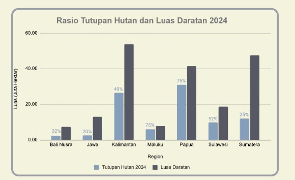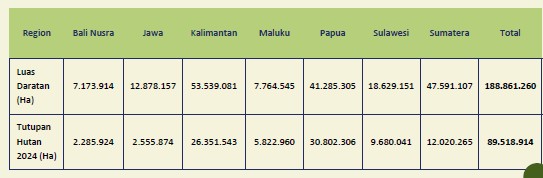 Dari Total 188,86 juta hektare daratan Indonesia 47%nya masih merupakan hutan alam pada tahun 2024. Angka ini didapat dari hasil keluaran model random forest yang diaplikasikan pada citra resolusi tinggi dengan nilai rata overall accuracy 0,91 ± 0,02 dan Kappa 0,82 ± 0,02. Analisis ini menunjukkan bahwa pada tahun 2023 luas hutan Indonesia berada pada angka 90,28 juta hektare dan pada 2024 luas hutan tersisa adalah 89.51 juta hektare sehingga dalam periode analisis terdapat 777 ribu hutan alam yang hilang. Sisa hutan ini tersebar pada tujuh region yang memiliki karakteristik pulau-pulau yang berbeda pula.