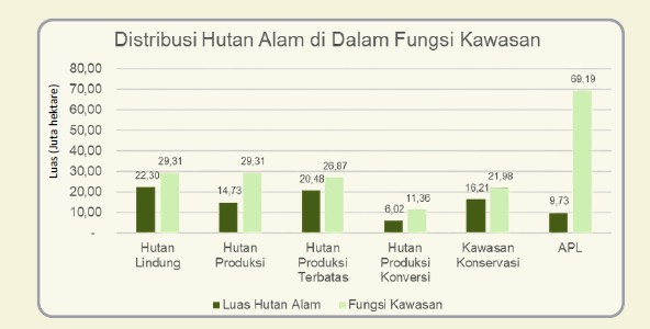 Secara penunjukkan kawasan 46% dari total luas hutan alam Indonesia berada pada kawasan hutan yang ditunjukkan untuk produksi, baik hutan produksi, hutan produksi terbatas, maupun hutan produksi konversi. Hal ini menandakan hampir setengah dari hutan alam Indonesia diperuntukan untuk pemanfaatan baik untuk pemungutan kayu maupun hasil hutan bukan kayu. Hanya 22,3% dan 16,21% hutan alam yang berada pada kawasan dengan penunjukan lindung dan konservasi. Terdapat juga sekitar 9,73 juta hektare hutan alam yang tidak masuk kedalam kawasan hutan/Areal Penggunaan Lain (APL), areal yang digunakan sebagai pemukiman, Kawasan Industri, Perkebunanan, Pertanian, Pertambangan dan lainnya.